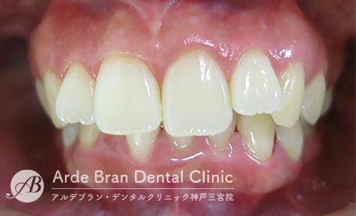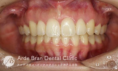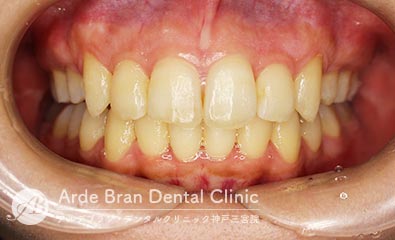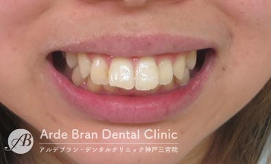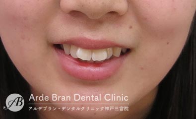 (20代女性 治療期間2年5カ月) - 前歯の突出感と歯のがたつきを改善したいとの事でご来院されました。なるべく目立たない装置で治療をしたいとご希望されたのでマウスピース矯正にて治療を行いました。治療途中に治療計画とのズレが生じましたが、顎間ゴムを使用しリカバリーを行いワイヤーで修正をかける事なくフィニッシュ出来ました。ワイヤーを併用だともう少し治療期間は短縮出来たかと思います。口元の突出感が改善し、歯磨きもしやすくなったとお喜び頂きました。