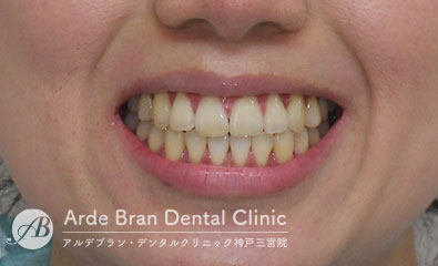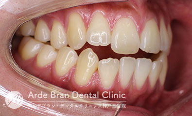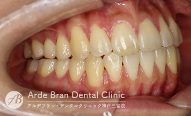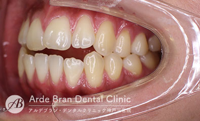 - 前歯の挺出(歯の先端方向への移動)と奥歯の圧下(歯の歯茎方向への移動)を行う事によって改善していきます。