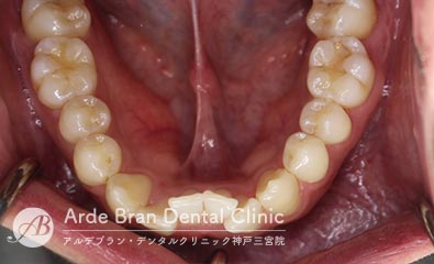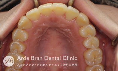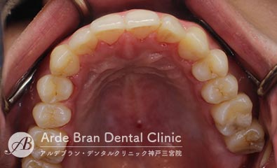 - 奥歯のかみ合わせと前歯のがたつきを治したいとの事でご来院されました。なるべく目立たない装置で固定式の装置での治療をご希望されたので、ハーフリンガル矯正にて治療を行いました。奥歯がすれ違って咬んでいる場合はご本人も気づいていない事も多いです。ただこの状態を放置しておくと、歯に大きく負担がかかり歯の寿命が短くなります。今回は上顎の口蓋にインプラントアンカーを植立し、外側に倒れた上顎の奥歯を内側に入れました。患者様より、長年歯並び歯並びが気になっていたので、これからは歯を見せて笑えるのが楽しみです。とのお声を頂きました。