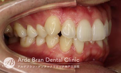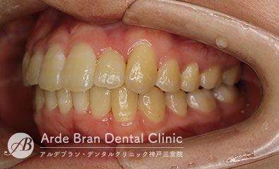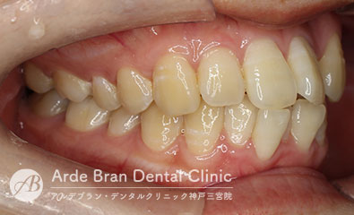 - 前歯の歯のがたつきを治したいとの事でご来院されました。なるべく目立たない装置で、可能であれば歯を抜きたくないとの事だったのでインビザラインフルにて治療を行いました。右側の奥歯のかみ合わせは問題ありませんでしたが、左側の上の奥歯が前方に寄ってる状態でした。そのため前歯が適切に生えるスペースが不足し内側に生えてきていました。この状態を改善するため、左側の奥歯を後ろに移動させ前歯が並ぶスペースを作ってから並べました。